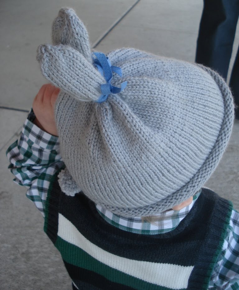 This hat is knit with Rowan Cashsoft DK - beautifully soft yarn! I LOVED knitting with this yarn. I would certainly look for this in the future. The gray was a perfect color for X, and it complimented his Easter outfit well! The pattern calls for a larger bunny tail on the back, but I didn't want it to interfere w/ X when he laid his head back in the car or something. So just a small one this time.